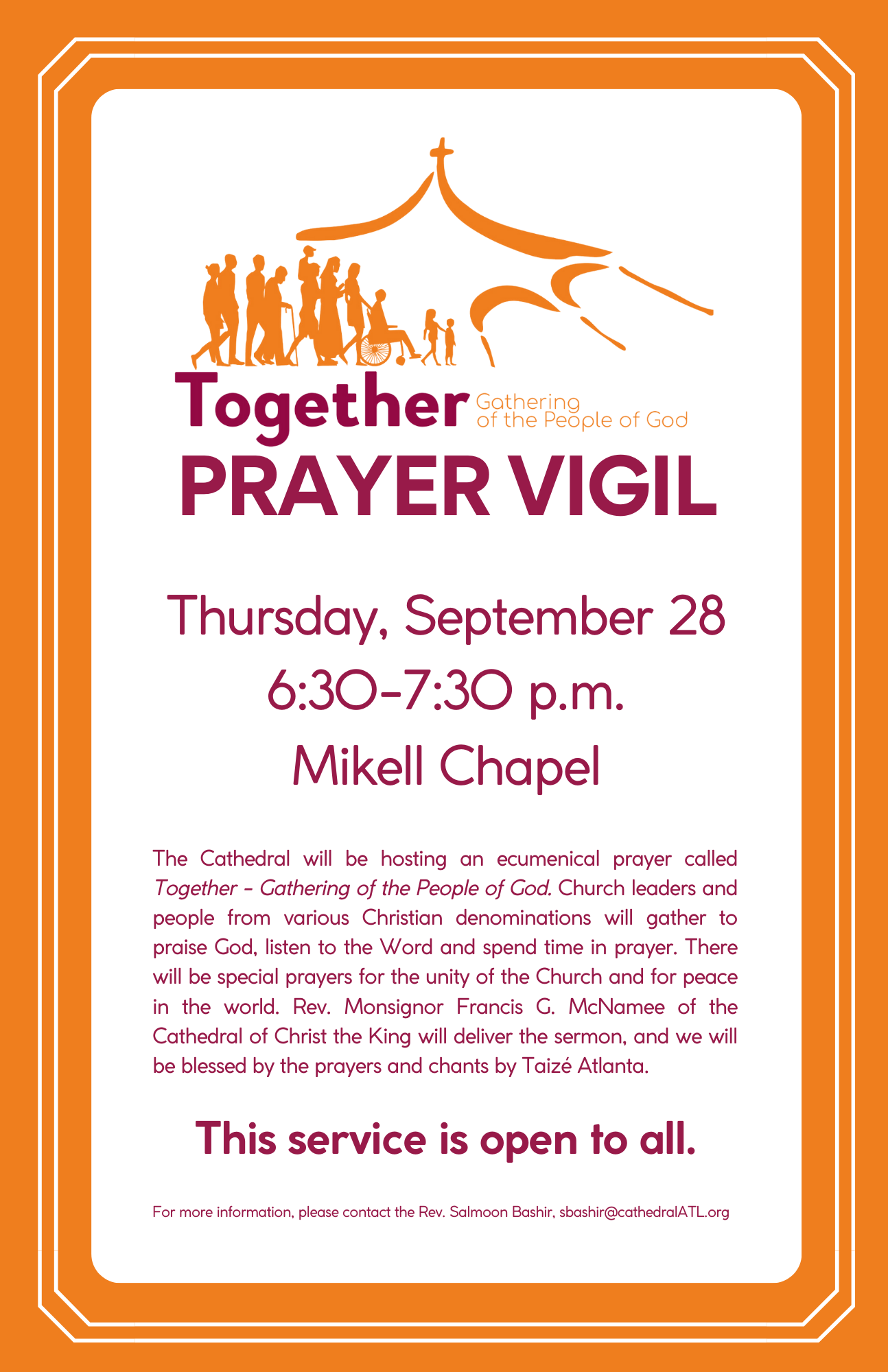 Together: Gathering of the People of God, an Ecumenical Prayer Vigil, September 14, 7:30 pm, St. Thomas More Catholic Church, 636 W. Ponce de Leon Ave. Decatur, GA 30030